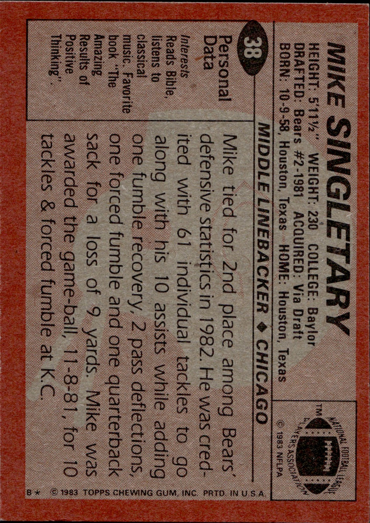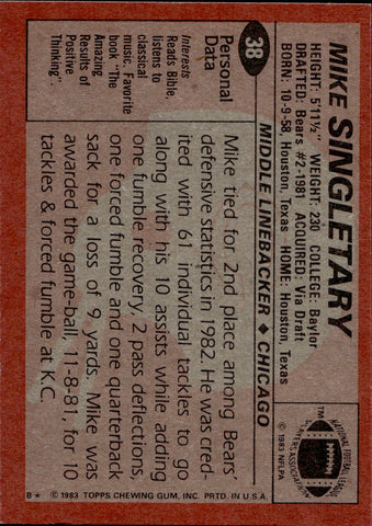 1983 Mike Singletary Topps Chicago Bears #38 BV$25
