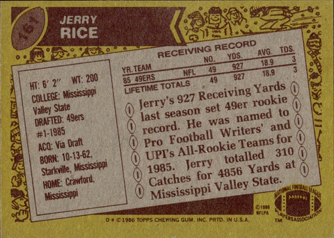 1986 Jerry Rice Topps ROOKIE RC #161 San Francisco 49ers HOF *NRMT*