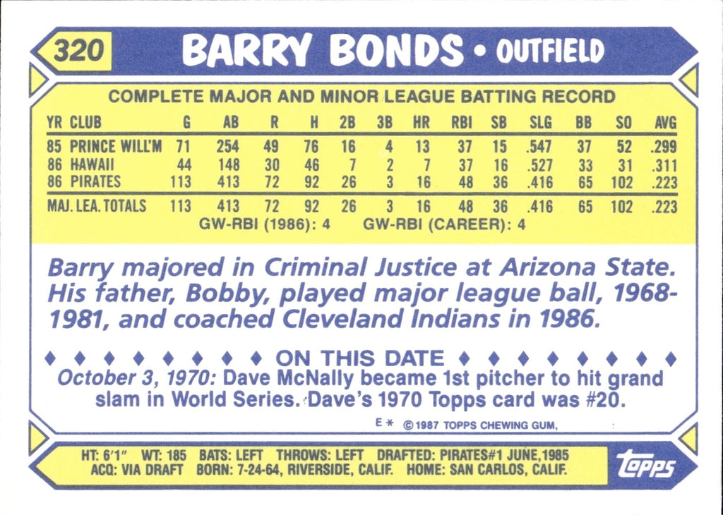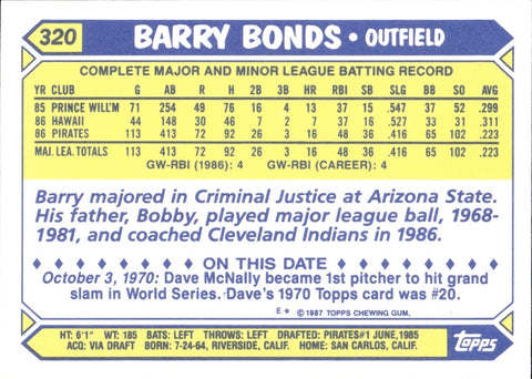 1987 Barry Bonds Topps TIFFANY ROOKIE RC #320 Pittsburgh Pirates