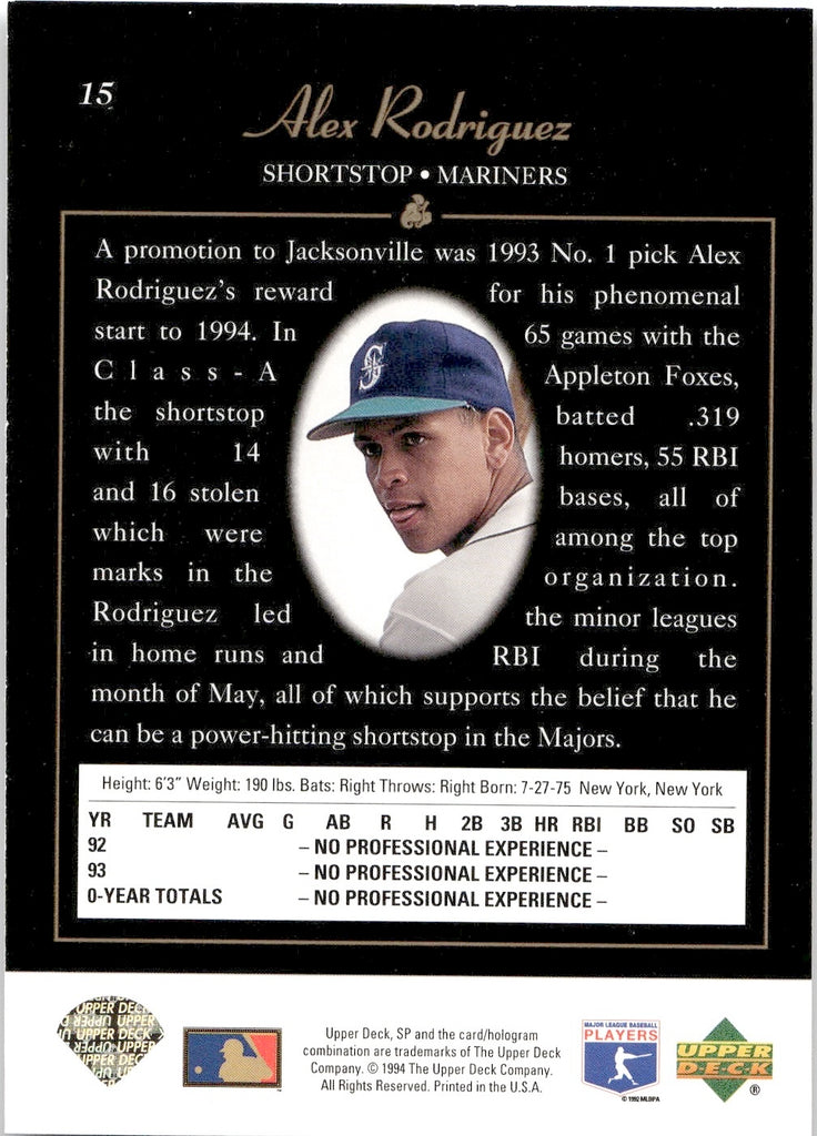 1994 Alex Rodriguez SP ROOKIE RC #15 Seattle Mariners 1