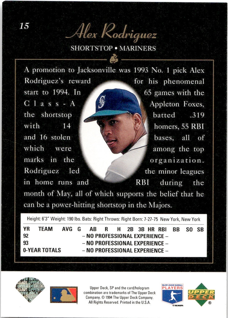 1994 Alex Rodriguez SP ROOKIE RC #15 Seattle Mariners 2