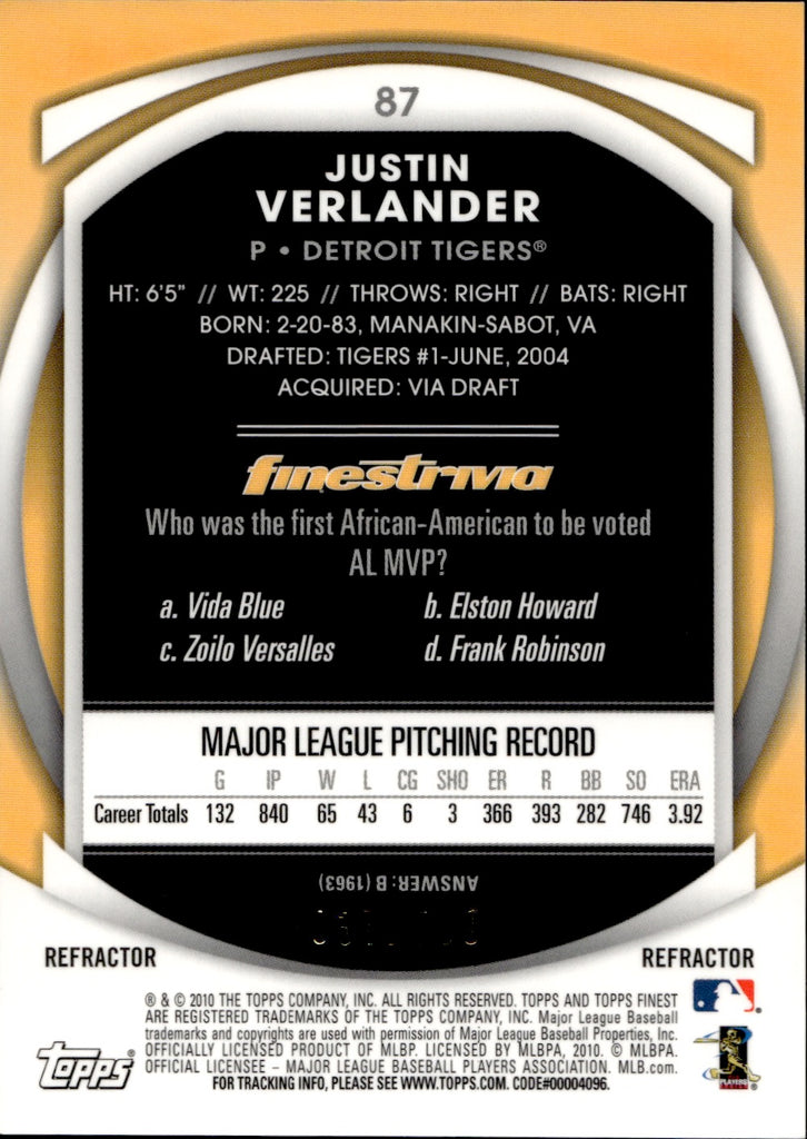 2010 Justin Verlander Topps Finest REFRACTOR 37/599 Detroit Tigers #87