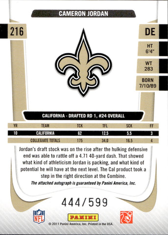 2011 Cameron Jordan Panini Prestige DRAFT PICKS RIGHTS AUTOGRAPH ROOKIE AUTO RC 444/599 #216 New Orleans Saints