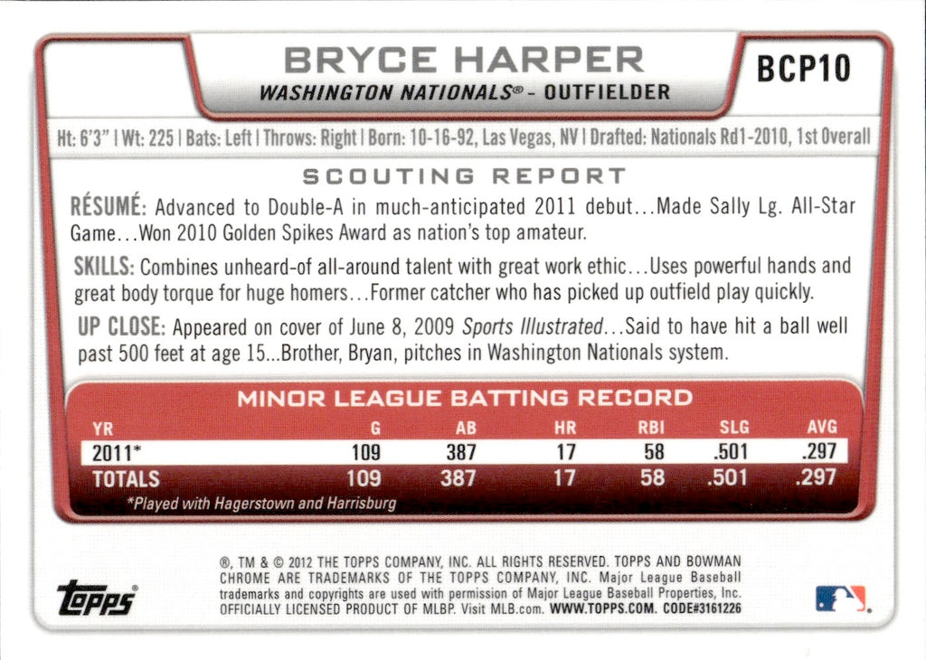 2012 Bryce Harper Bowman Chrome PROSPECT #BCP10 Washington Nationals