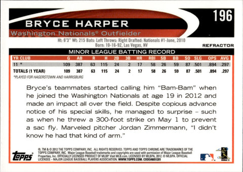 2012 Bryce Harper Topps Chrome ROOKIE REFRACTOR RC #196 Washington Nationals