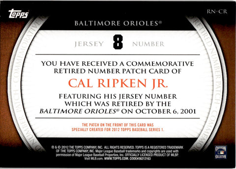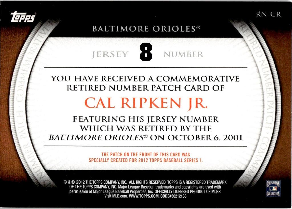 2012 Cal Ripken Jr. Topps Series 1 COMMEMORATIVE RETIRED NUMBER PATCH Baltimore Orioles #RN-CR