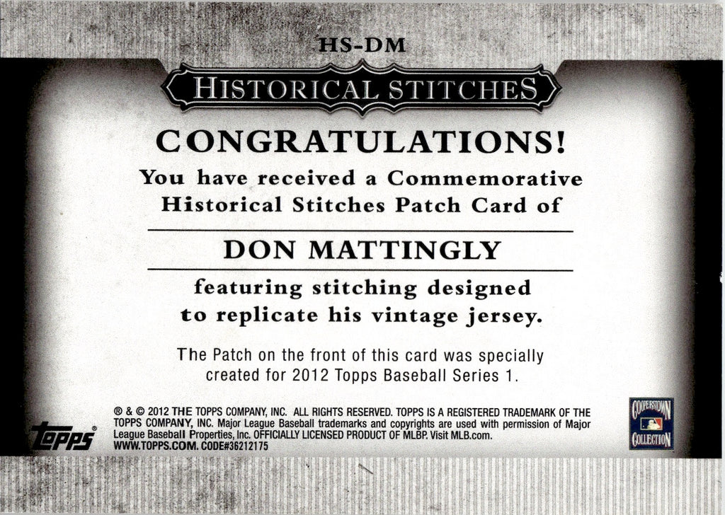 2012 Don Mattingly Topps Series 1 HISTORICAL STITCHES PATCH New York Yankees #HS-DM