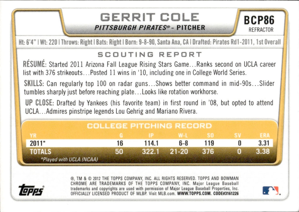2012 Gerrit Cole Bowman Chrome 1ST BOWMAN RED WAVE #BCP86 Pittsburgh Pirates *Print Line*