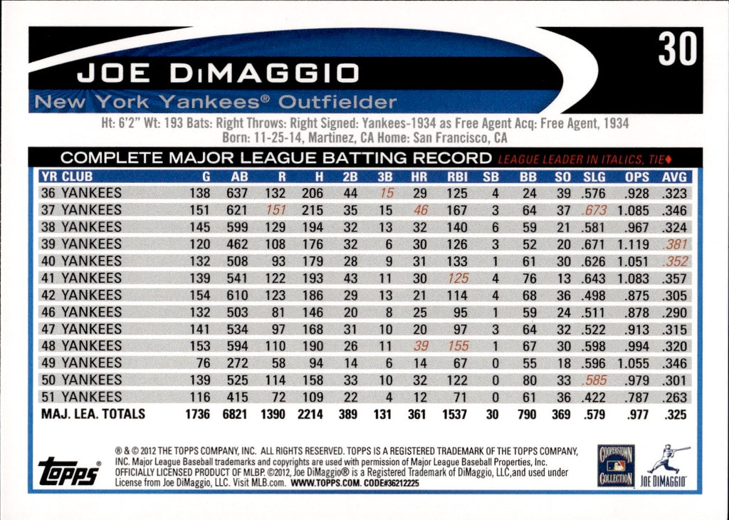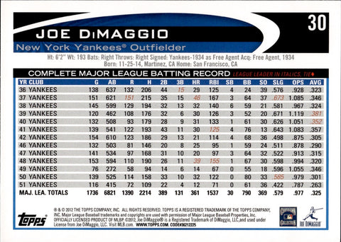2012 Joe DiMaggio Topps SP LEGEND VARIATION #30 New York Yankees HOF