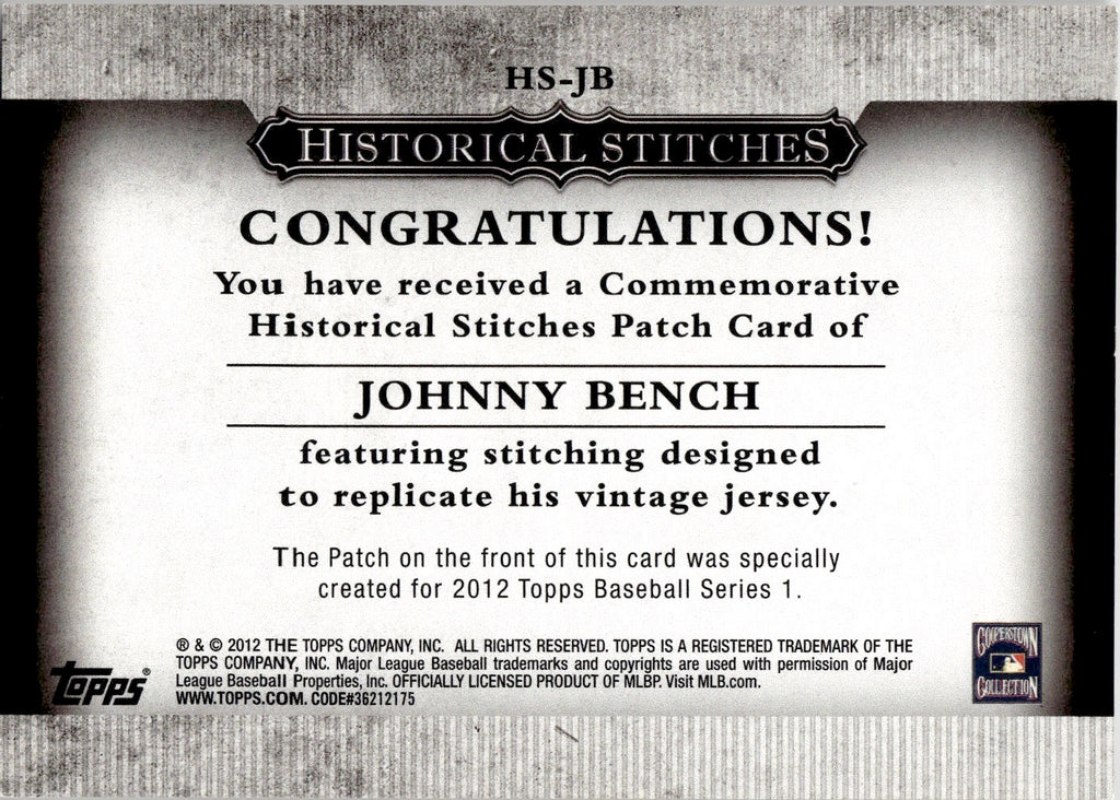 2012 Johnny Bench Topps Series 1 HISTORICAL STITCHES PATCH Cincinnati Reds #HS-JB