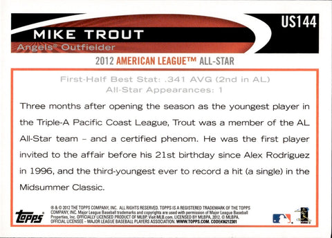2012 Mike Trout Topps Update SP PHOTO VARIATION #US144 Anaheim Angels