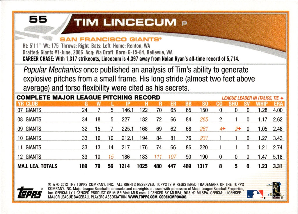 2013 Tim Lincecum Topps SP PHOTO VARIATION #55 San Francisco Giants