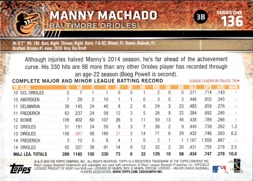 2015 Manny Machado Topps SERIES 1 WITH MIKE TROUT SP PHOTO VARIATION #136 Baltimore Orioles