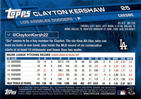 2017 Clayton Kershaw Topps Chrome BLUE REFRACTOR 141/150 #25 Los Angeles Dodgers