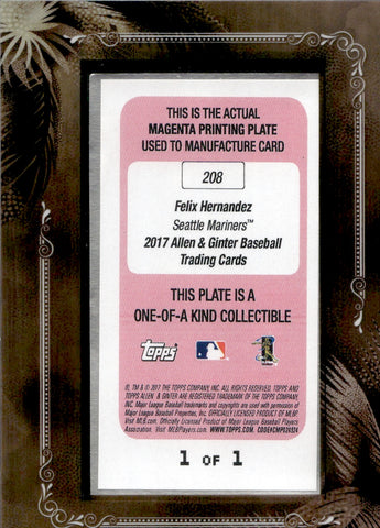 2017 Felix Hernandez Topps Allen & Ginter MAGENTA PRINTING PLATE 1/1 #208 Seattle Mariners