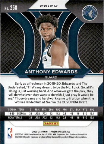 2020-21 Anthony Edwards Panini Prizm RED WHITE BLUE ROOKIE RC #258 Minnesota Timberwolves