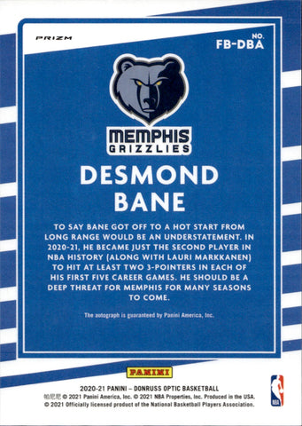 2020-21 Desmond Bane Donruss Optic ROOKIE FAST BRK AUTO AUTOGRAPH RC #FB-DBA Memphis Grizzlies