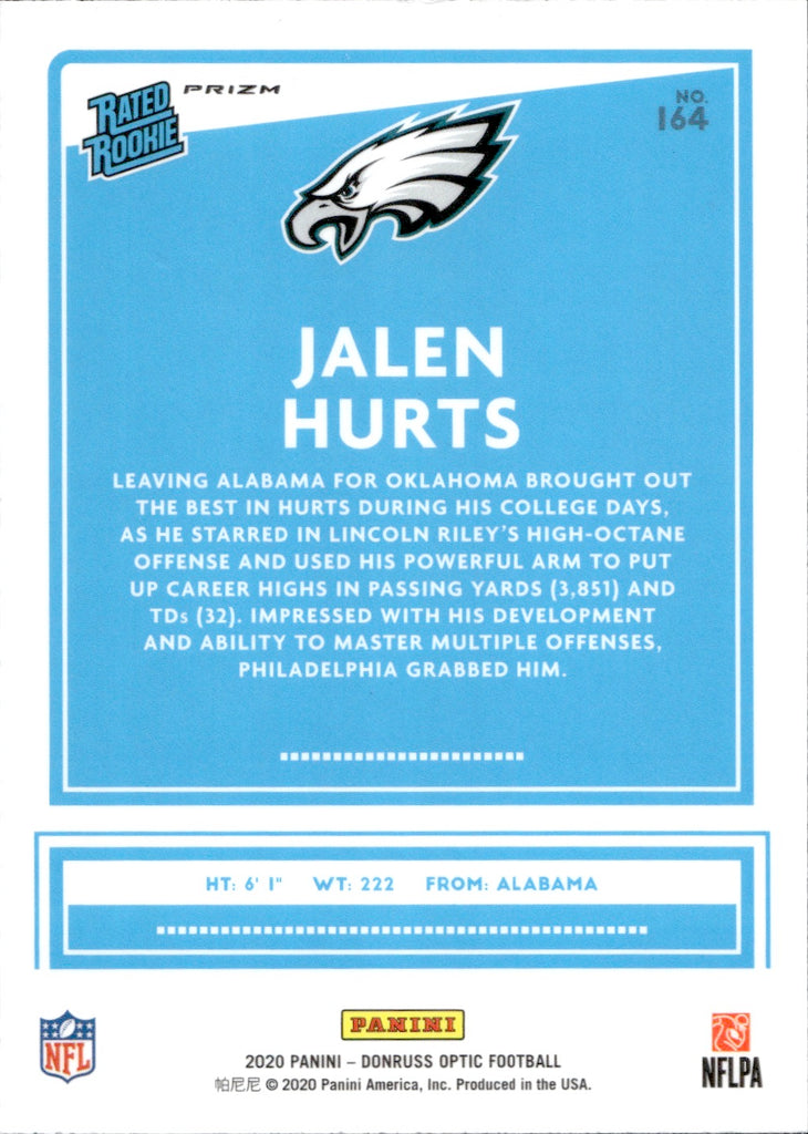 2020 Jalen Hurts Panini Donruss Optic RATED ROOKIE HOLO PRIZM RC #164 Philadelphia Eagles