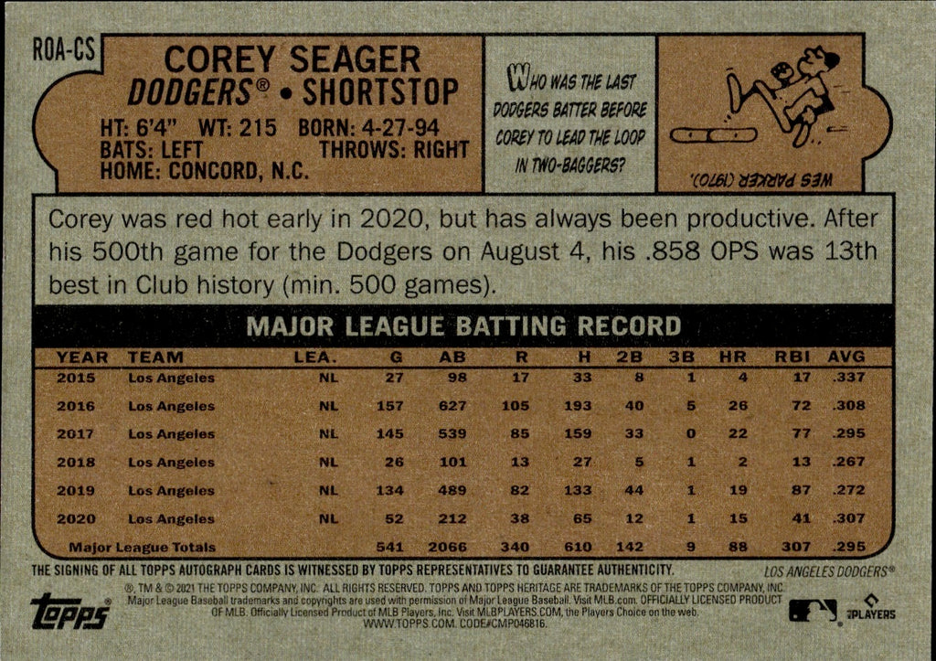 2021 Corey Seager Topps Heritage REAL ONE AUTO AUTOGRAPH #ROA-CS Los Angeles Dodgers