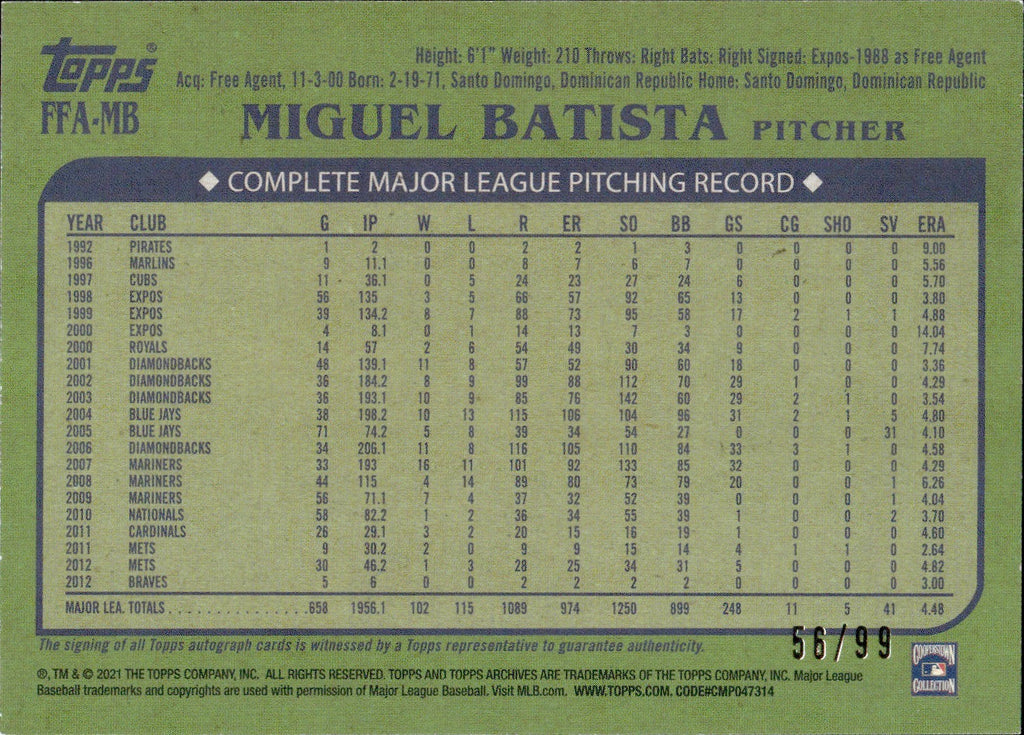 2021 Miguel Batista Topps Archives FAN FAVORITES 1982 DESIGN SILVER AUTOGRAPH AUTO 56/99 #FFA-MB Arizona Diamondbacks