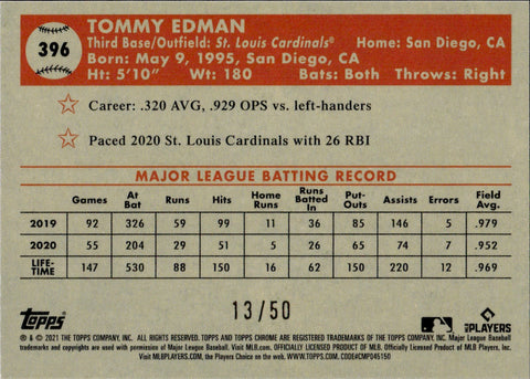 2021 Tommy Edman Topps Chrome PLATINUM ANNIVERSARY ROSE GOLD WAVE REFRACTOR 13/50 #396 St. Louis Cardinals