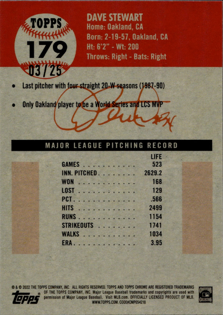 2022 Dave Stewart Topps Chrome Platinum Anniversary TOILE WHITE ORANGE REFRACTOR 3/25 Oakland Athletics #179