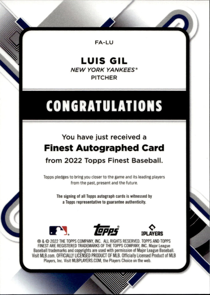 2022 Luis Gil Topps Finest REFRACTOR ROOKIE AUTO AUTOGRAPH #FA-LU New York Yankees