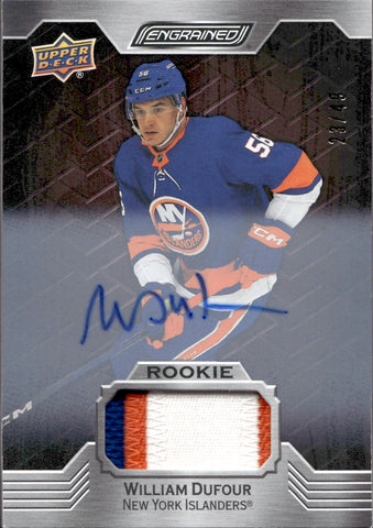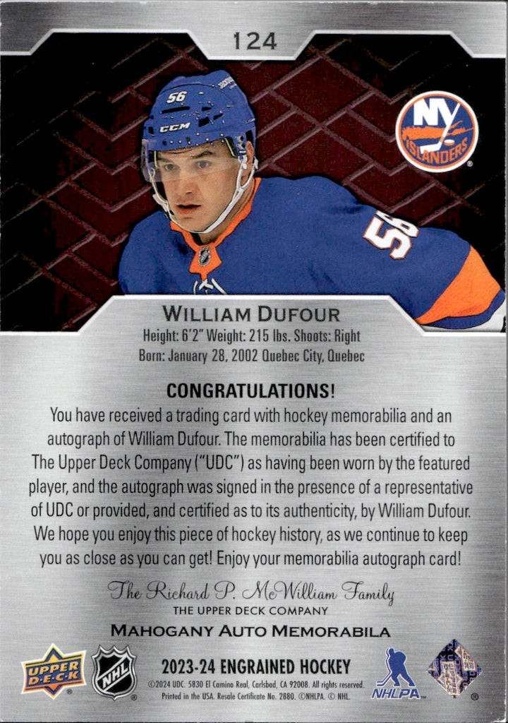 2023-24 William Dufour Upper Deck Engrained ROOKIE MAHOGANY AUTO MEMORABILIA 23/49 AUTOGRAPH PATCH RC #124 New York Islanders