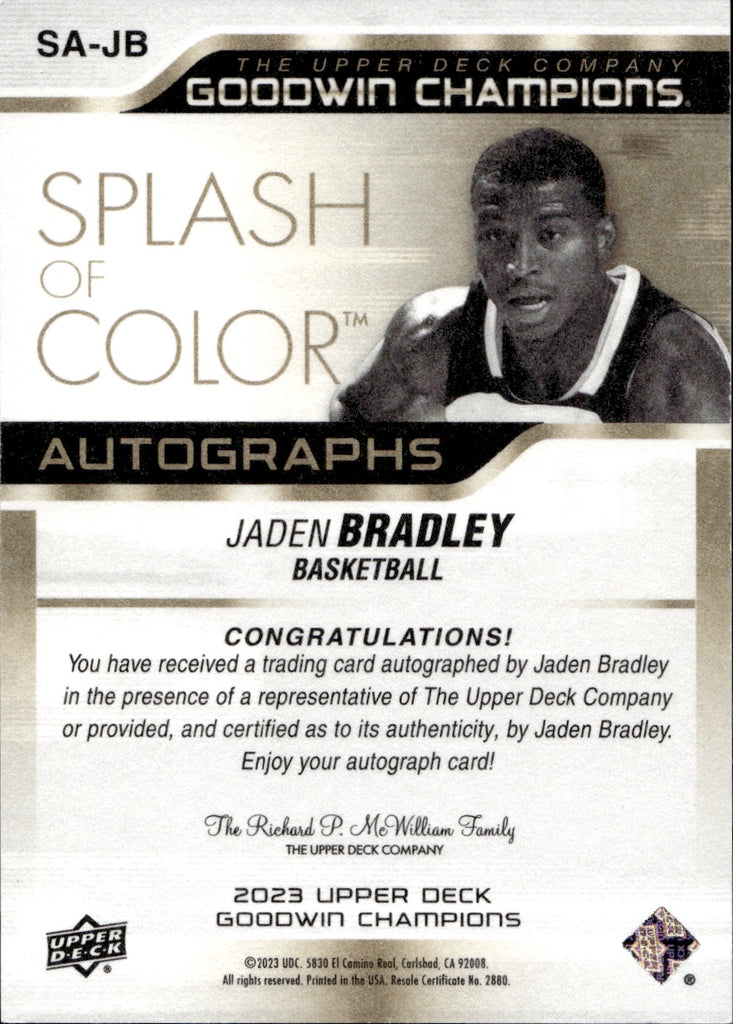 2023 Jaden Bradley Upper Deck Goodwin Champions SPLASH OF COLOR ROOKIE AUTO AUTOGRAPH RC #SA-JB Arizona Wildcats