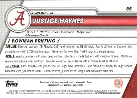 2023 Justice Haynes Bowman University Chrome 1ST BOWMAN AUTO AUTOGRAPH #85 Alabama Crimson Tide