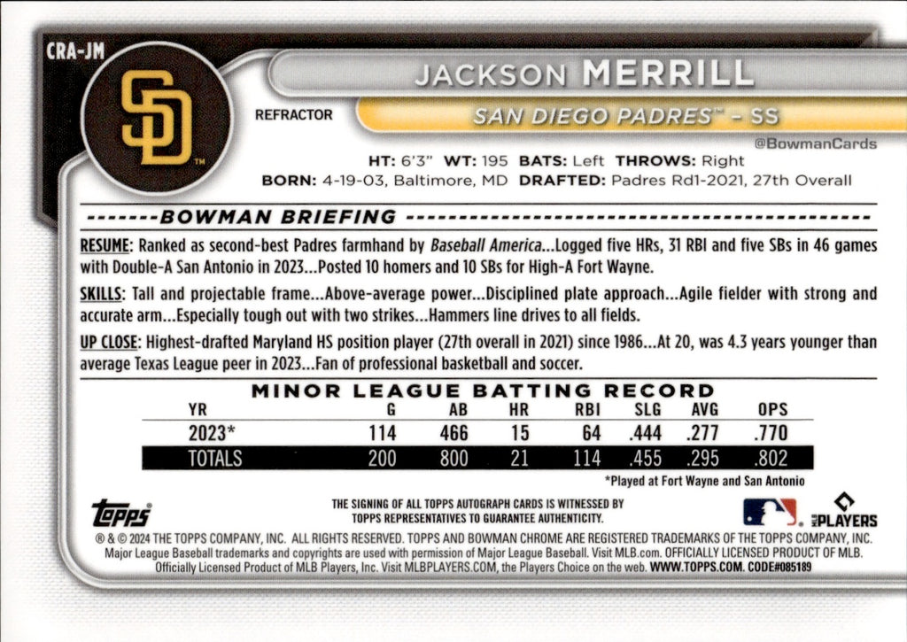 2024 Jackson Merrill Bowman Chrome REFRACTOR ROOKIE AUTO 301/499 AUTOGRAPH RC #CRA-JM San Diego Padres