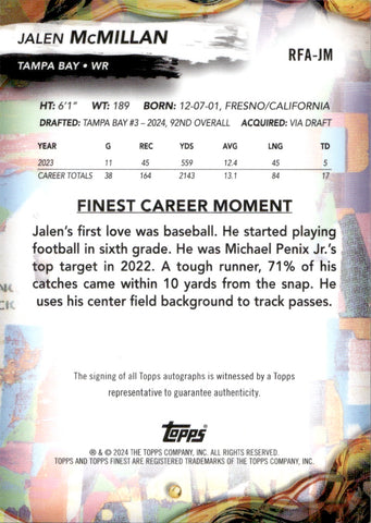 2024 Jalen McMillan Topps Finest GOLD REFRACTOR AUTOGRAPH ROOKIE 4/50 AUTO RC #RFA-JM Tampa Bay Buccaneers