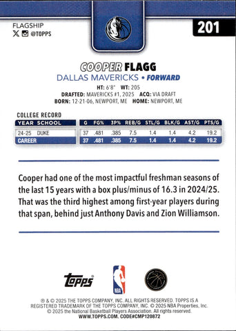 2025-26 Cooper Flagg Topps ROOKIE RC #201 Dallas Mavericks
