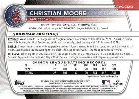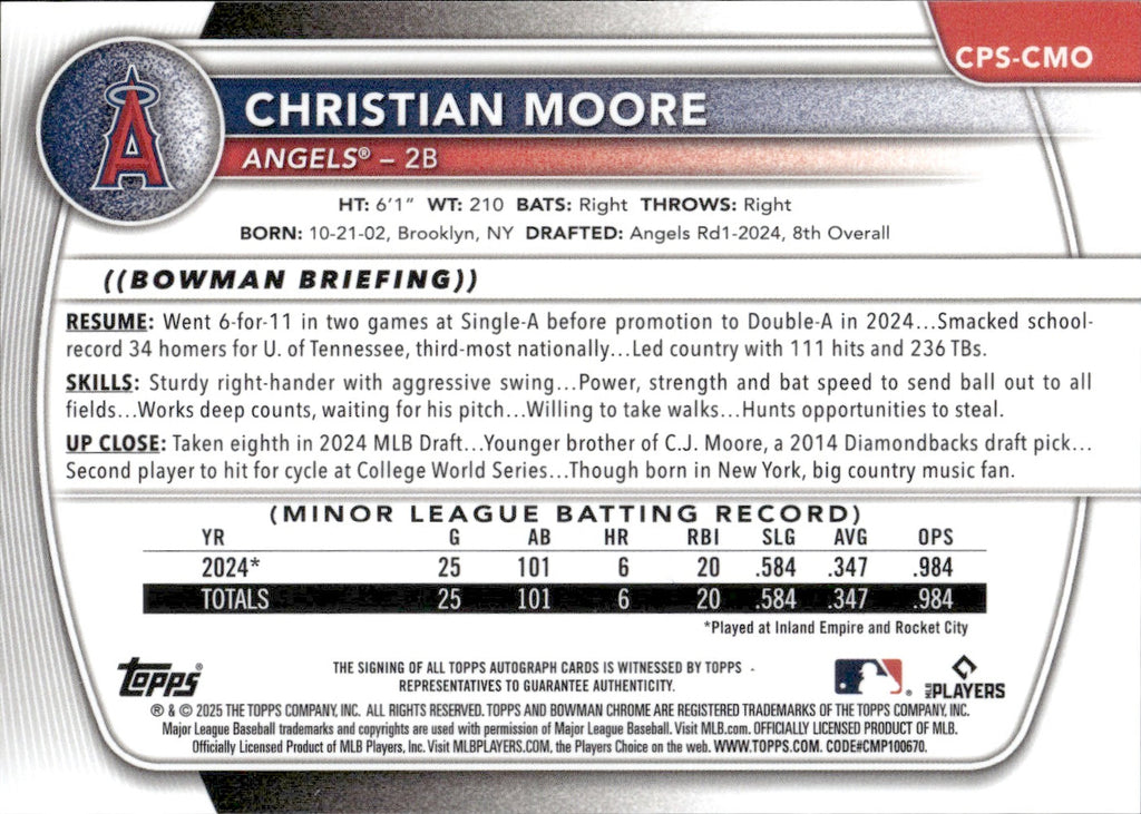2025 Christian Moore Bowman Chrome Prospects Sapphire BLUE AUTO AUTOGRAPH 107/199 #CPS-CMO Los Angeles Angels