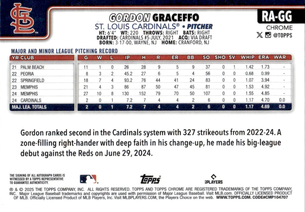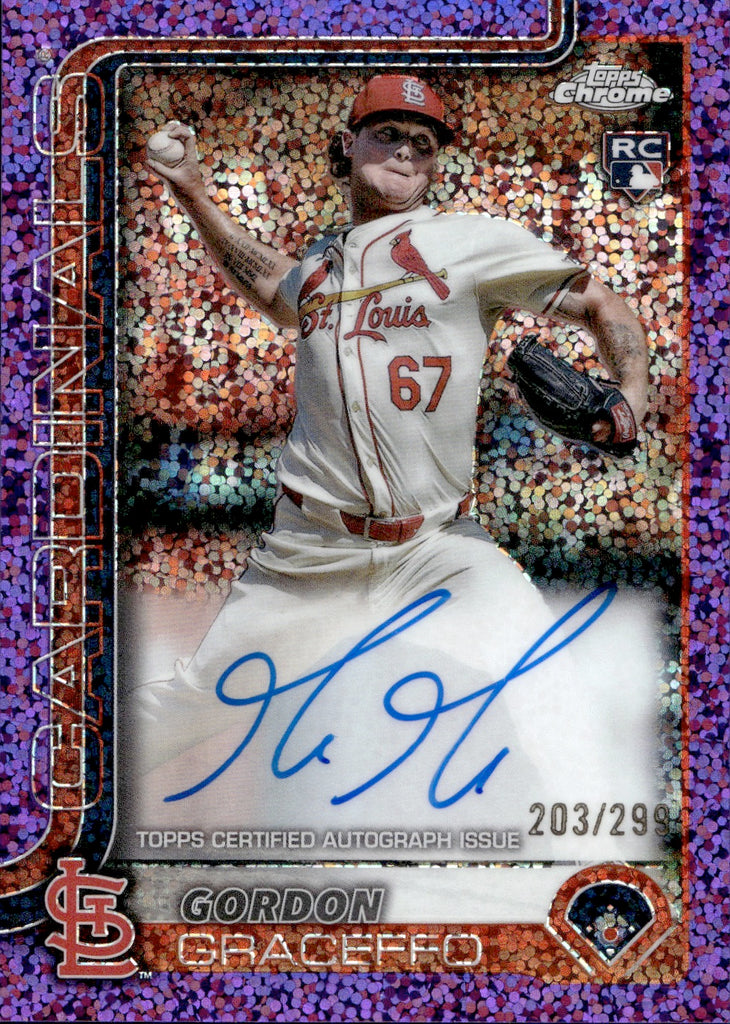 2025 Gordon Graceffo Topps Chrome PURPLE SPECKLE REFRACTOR AUTOGRAPH ROOKIE RC AUTO 203/299 #RA-GG St. Louis Cardinals