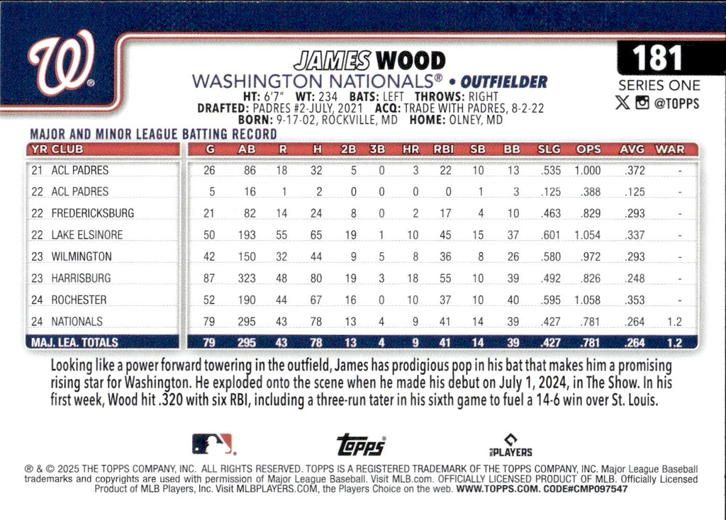 2025 James Wood Topps Series 1 CONFETTI ROOKIE RC #181 Washington Nationals