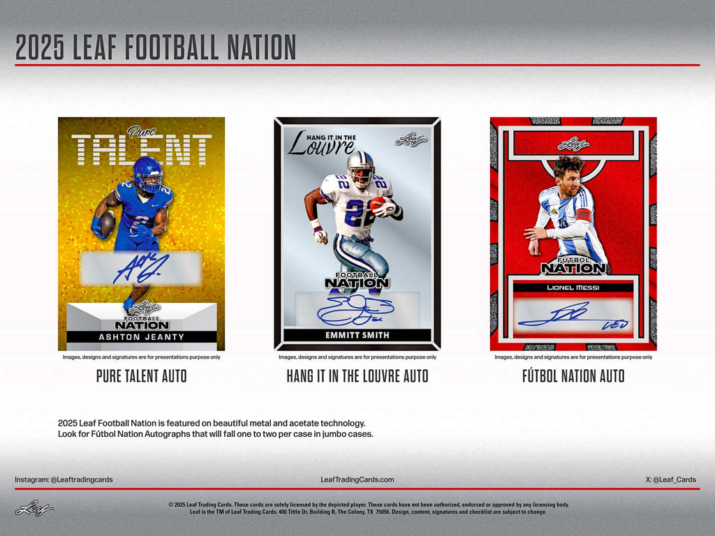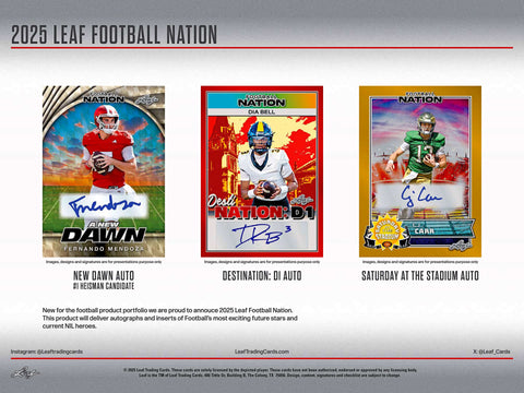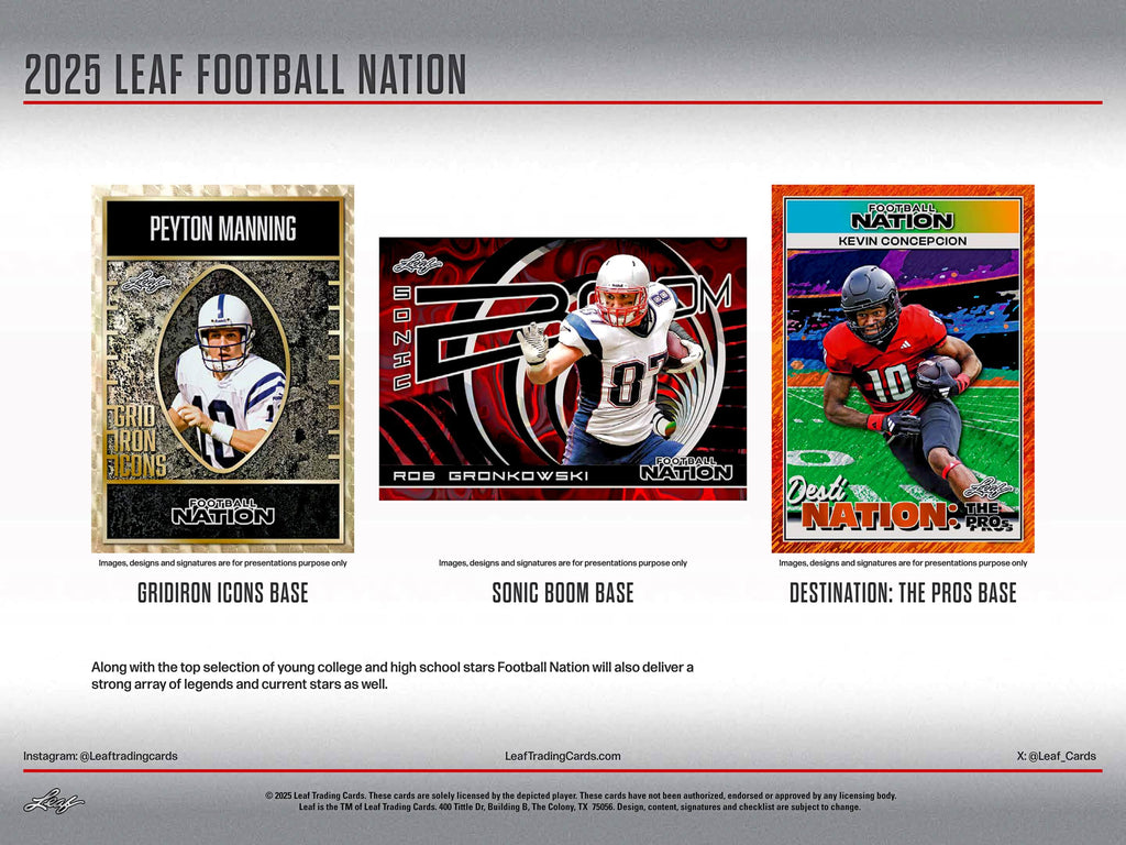 - New for the football product portfolio we are proud to announce 2025 Leaf Football Nation. This product will deliver autographs and inserts of Football’s most exciting future stars and current NIL heroes!