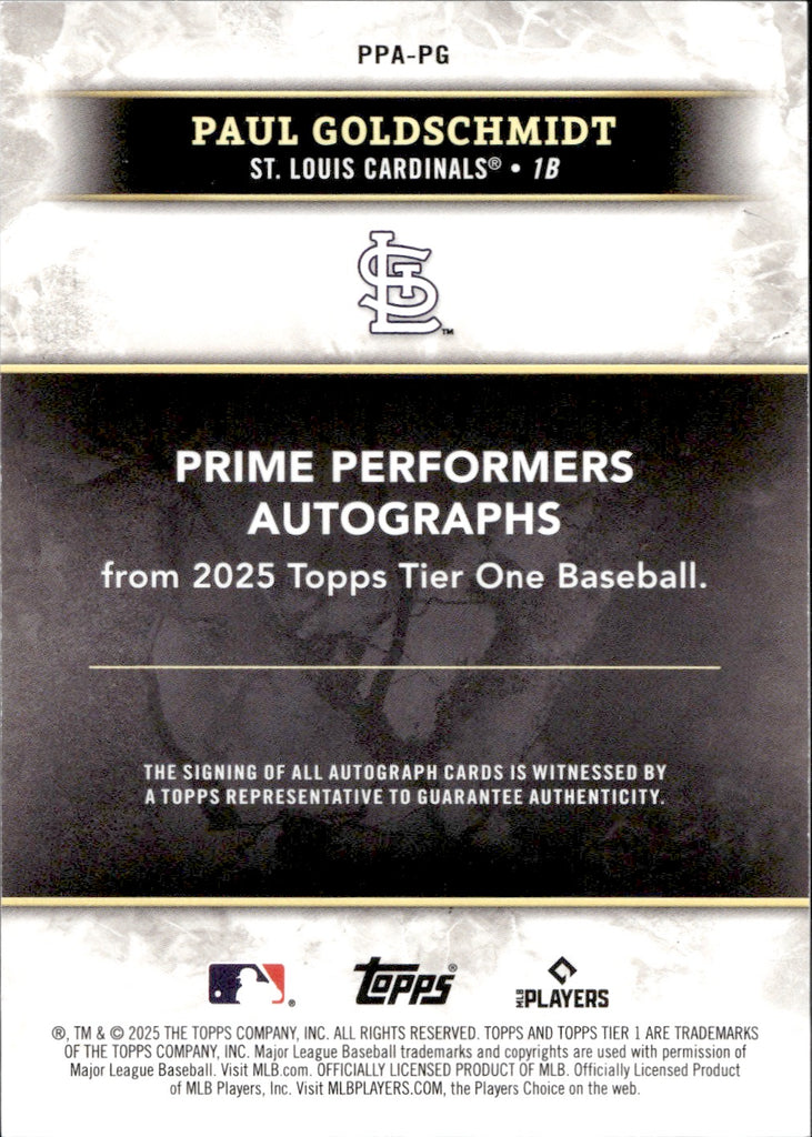 2025 Paul Goldschmidt Topps Tier One PRIME PERFORMERS AUTOGRAPHS BLUE FOIL AUTO 11/25 #PPA-PG St. Louis Cardinals