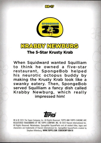 2025 The 5-Star Krusty Krab Topps Chrome Spongebob Squarepants ORANGE REFRACTOR 25/25 #BB-17