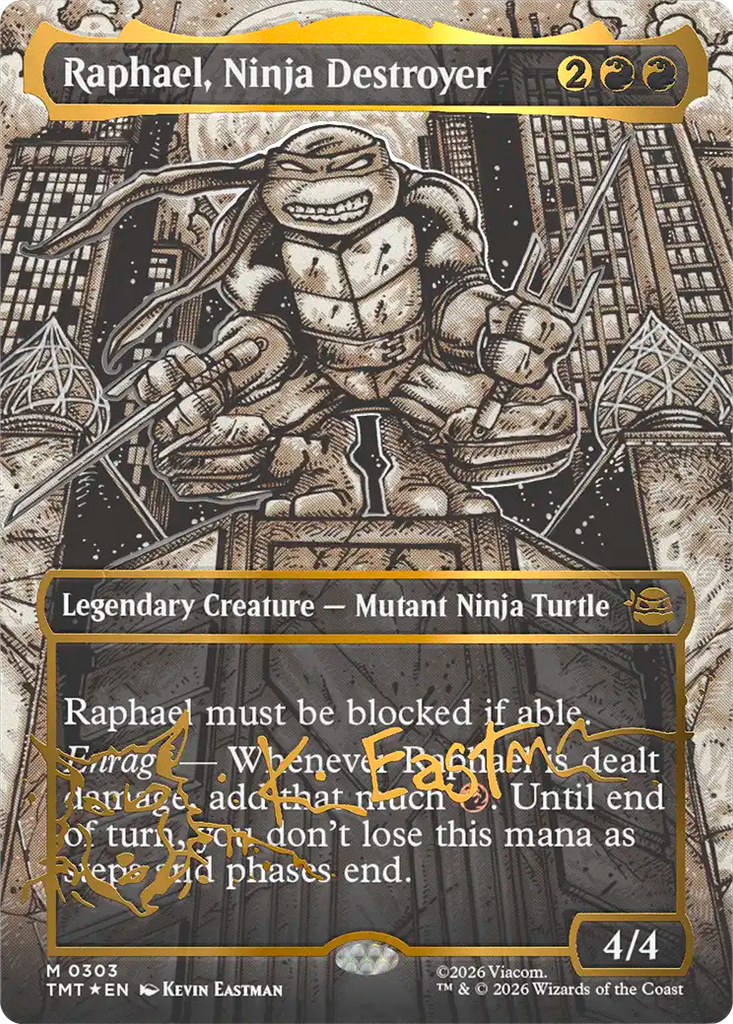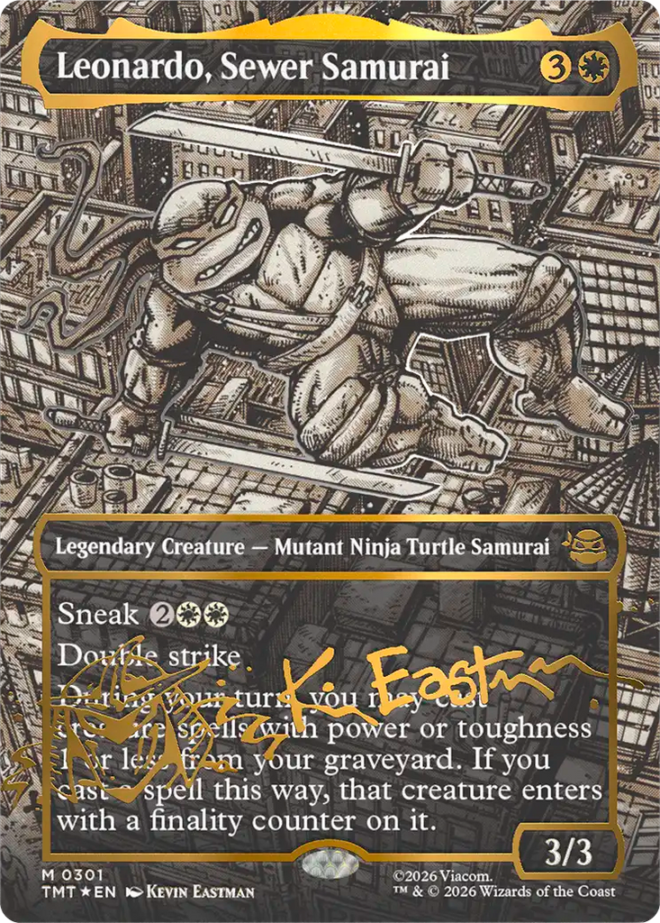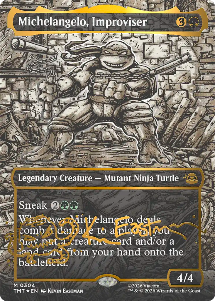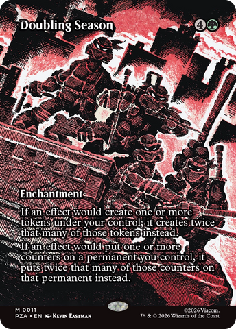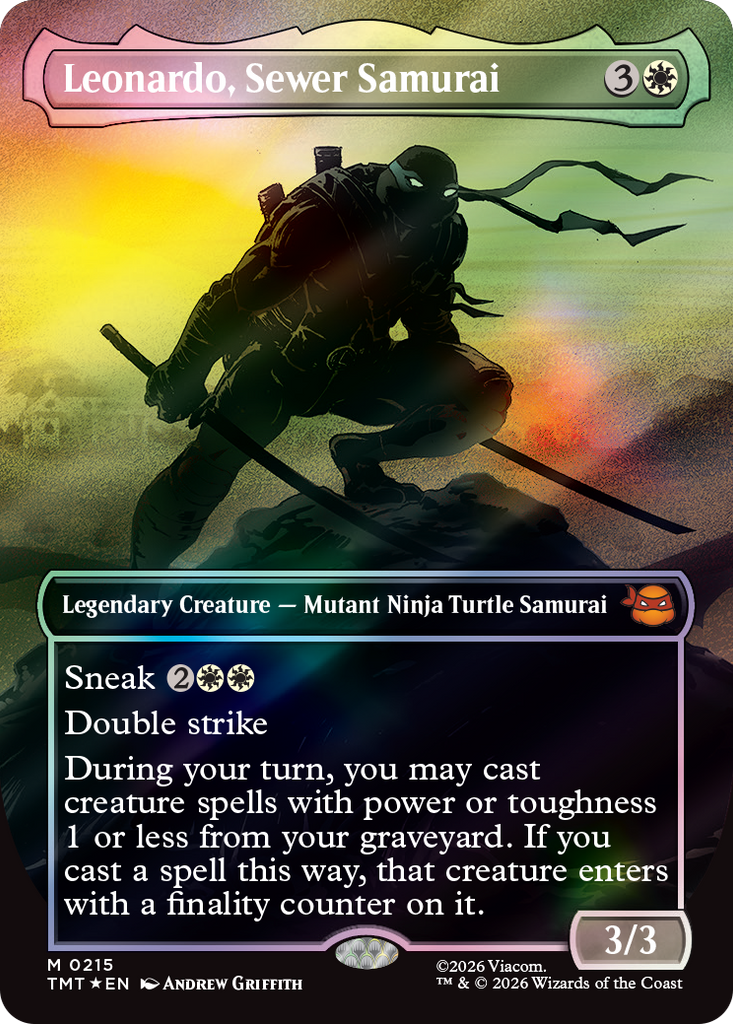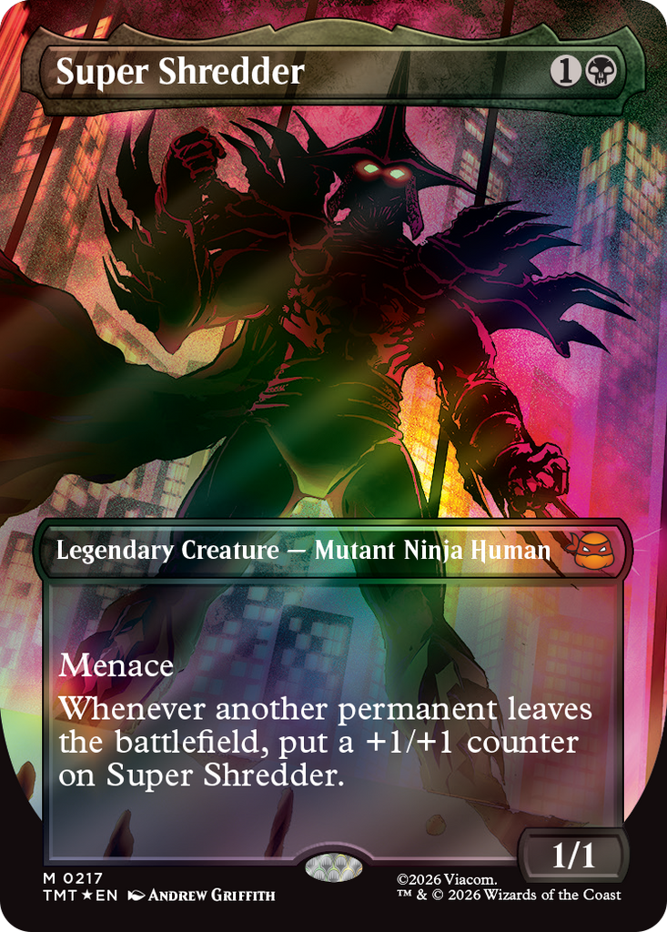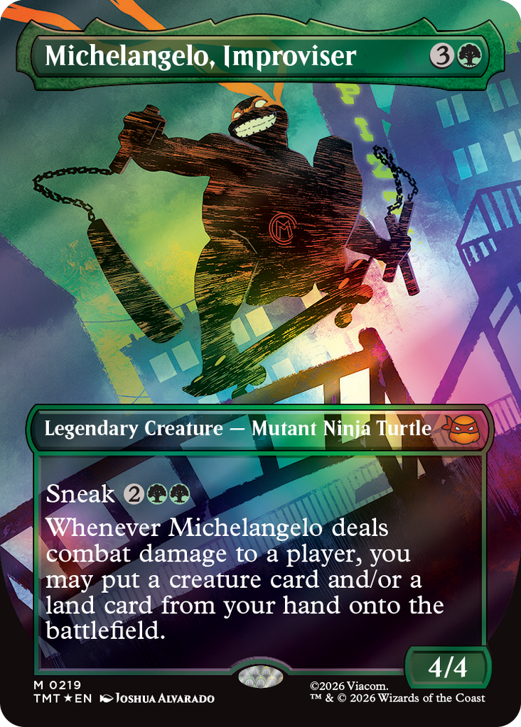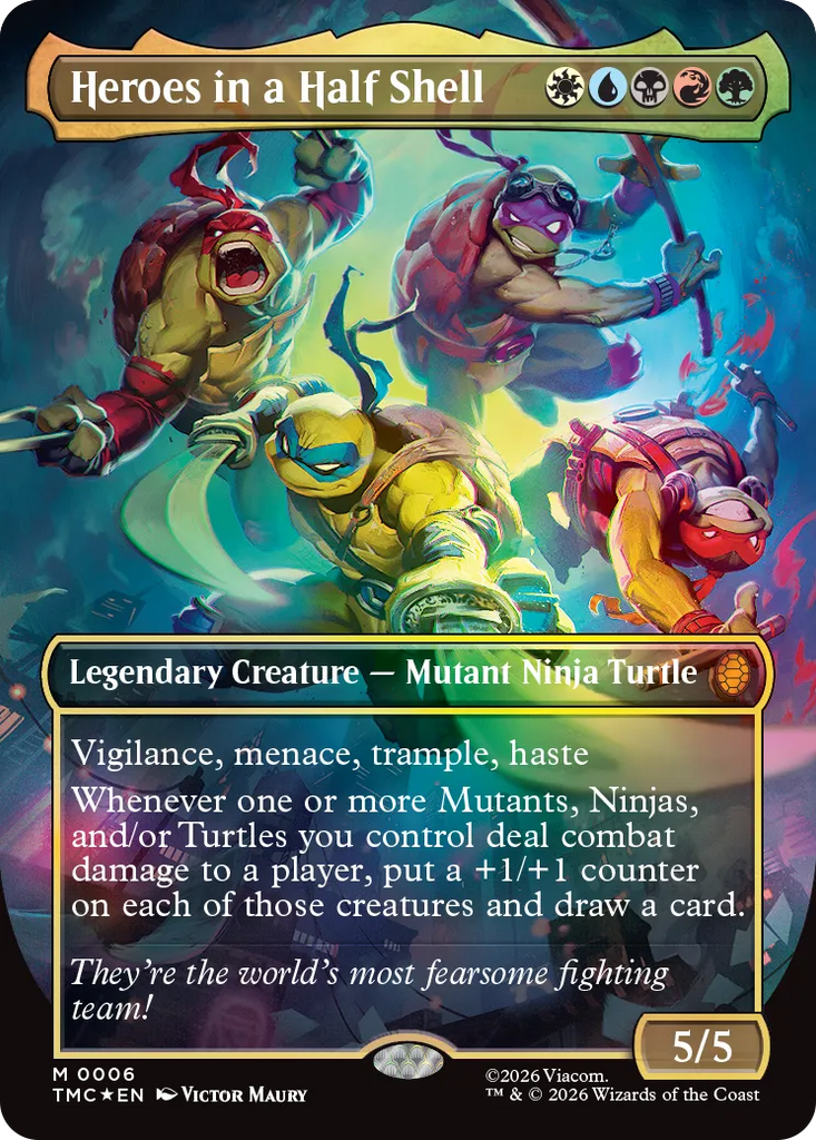 Magic: The Gathering gets a quadruple dose of mutagenic mayhem as the Teenage Mutant Ninja Turtles make their debut on the battlefield! Collect, construct, and combat with an iconic roster of allies and enemies from four decades of time-tested Turtle-mania. Get the drop on Shredder's goons with the all-new sneak mechanic, then enhance your team's strength with Mutagen tokens to rise triumphant like the true heroes of New York!